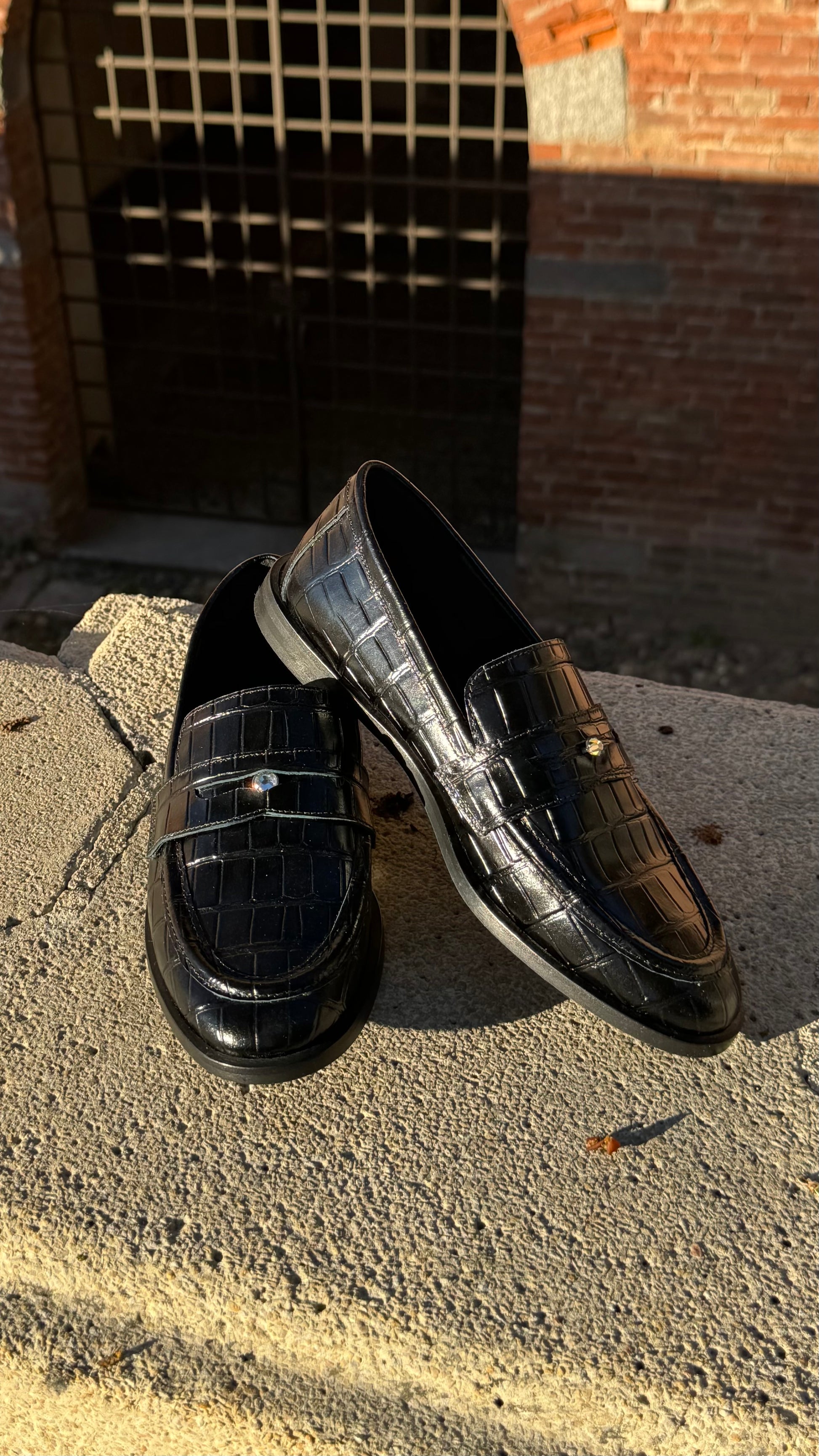 LUCE è il mocassino PSYCO in pelle stampa cocco lucida, caratterizzato dalla bocca di lupo con inserto gioiello che cattura la luce a ogni passo.