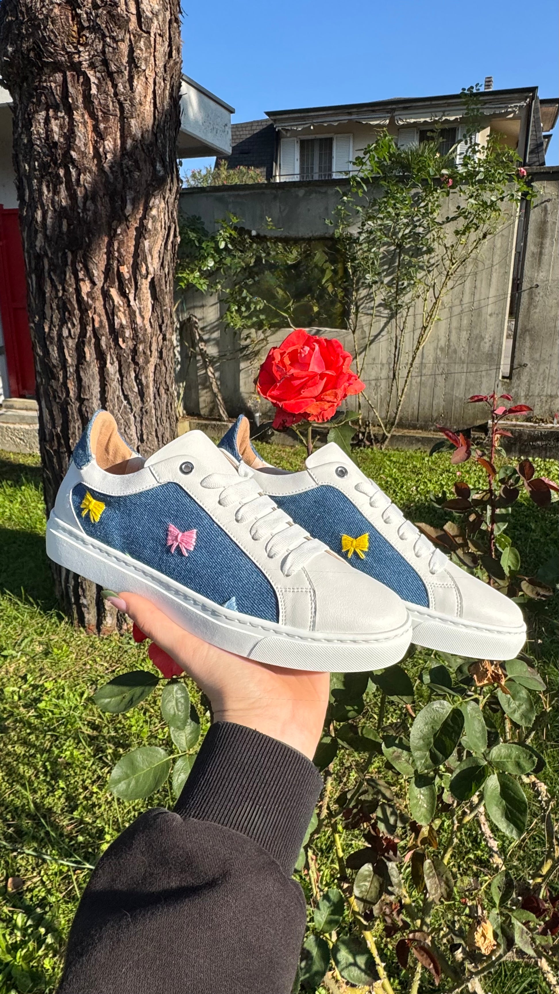 Questa sneaker è realizzata in nappa bianca con laterali in denim, impreziosita da fiocchi multicolor cuciti a mano 🌈.